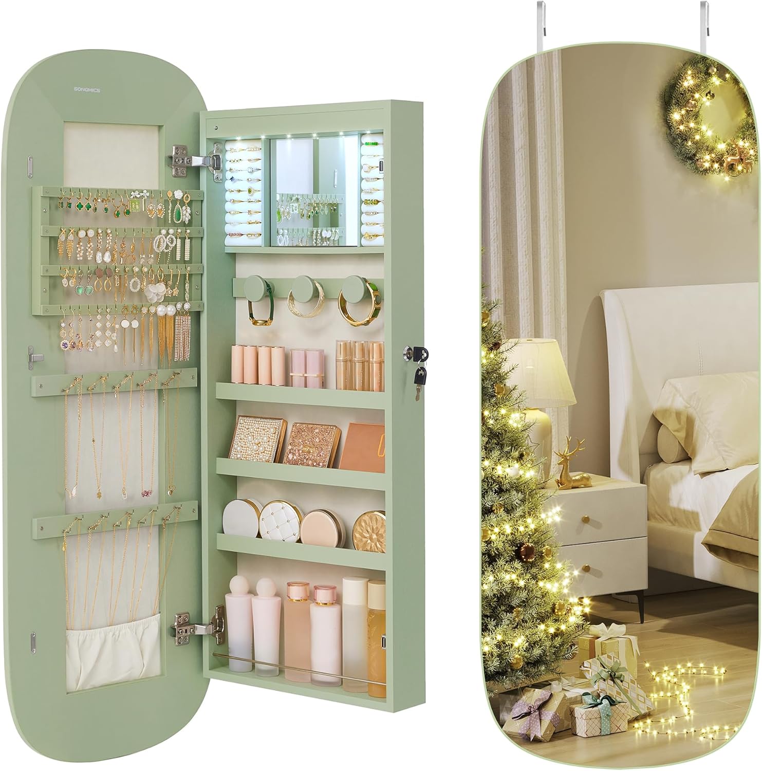 - 【LIGHT-UP INTERIOR MIRROR】The jewelry cabinet contains an interior mirror, removing the need to constantly open and close the door to view yourself during your makeup routine. Paired with natural-looking LED lights, it's the perfect makeup companion