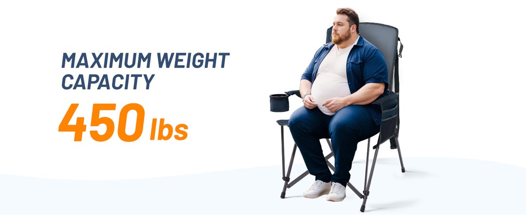 Answer: The Oversized Camping Chair supports a weight capacity of up to 450-500 lbs. This robust construction ensures durability and stability for various body types, making it ideal for outdoor settings. Whether you're camping, fishing, or attending a sporting event, this chair provides peace of mind, knowing it can accommodate most adults comfortably.